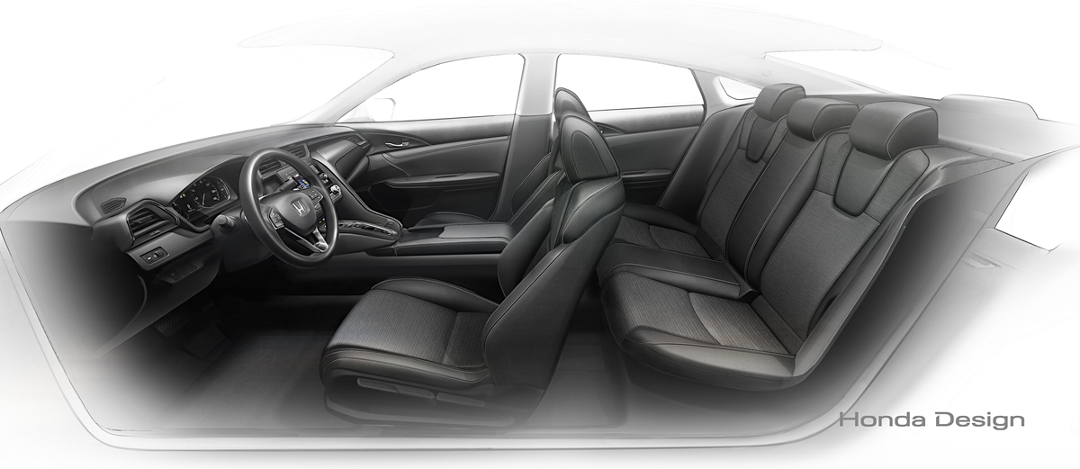 The five-passenger cabin for the new Insight looks plush and spacious in this illustration from Honda Design. The elimination of a traditional gearshift opens up more space for the console between the front seats.