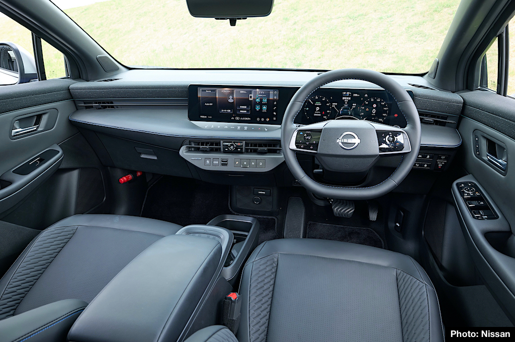 AUTECH interior enhancements include a tailor-wrapped steering wheel with blue stitching, black instrument panel with blue stitching and piping, AUTECH logos, and black armrest with center console box. The new LEAF B7 in Japan has a 78kWH battery, 12.3-inch dual displays, and offers AC external power supply connector, plus V2H (Vehicle to Home) functionality.