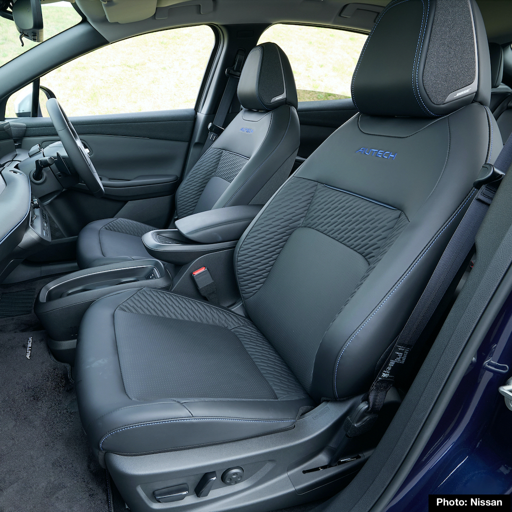 LEAF AUTECH seats are trimmed with exclusive black TailorFit™ material, and include AUTECH logo embroidery with blue stitching. TailorFit is described as a next-generation material that provides comfort and a soft feel. Black door trim is also included.