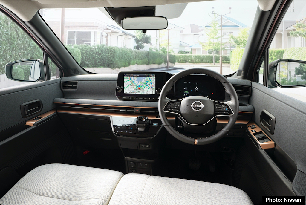 Sakura’s four-passenger interior features a contemporary appearance. It includes “sofa-design” seats, a twin-spoke steering wheel, a 7-inch Advanced Drive Assist Display, electric shifter, Eco, Standard, and Sport drive modes, plus an available 9-inch NissanConnect navigation system.