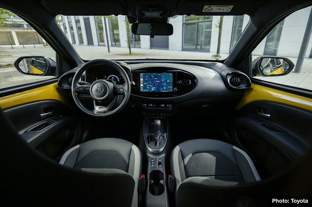 While all Aygo X models receive enhanced good looks with new front styling, the GR Sport gains some unique elements. Color treatments include a Bi-tone+ exterior with gloss black hood and roof, plus available metallic Mustard body color.
