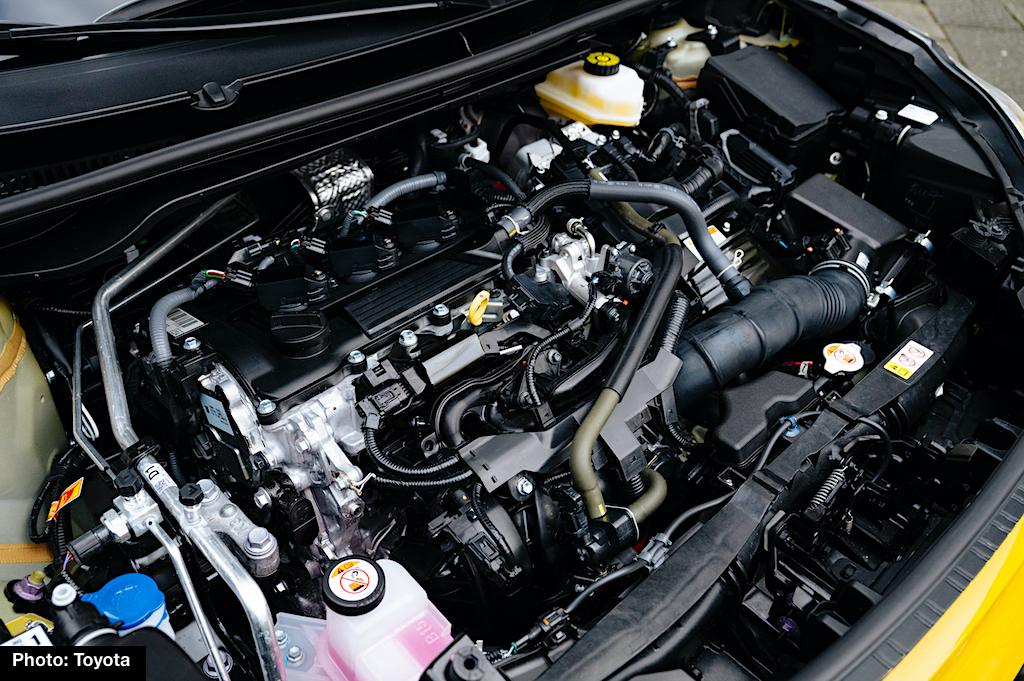Aygo X is powered by a new 1.5-liter 3-cylinder DOHC gas engine with VVT-i and direct injection, plus a front-mounted electric motor. Combined output is rated at 116 DIN hp (59 kW) and 141 Nm torque. Power has increased (+44 DIN hp) compared to the previous model that featured a 1.0-liter gas engine without the hybrid system.