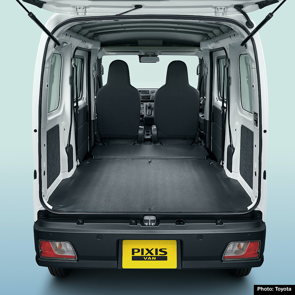 The above view, offering a different angle on the load space, shows the full-length flat floor with the rear seat folded down. Kei commercial vehicles are very popular in Japan, with compact exteriors and spacious interiors welcomed by fleet and individual business users.