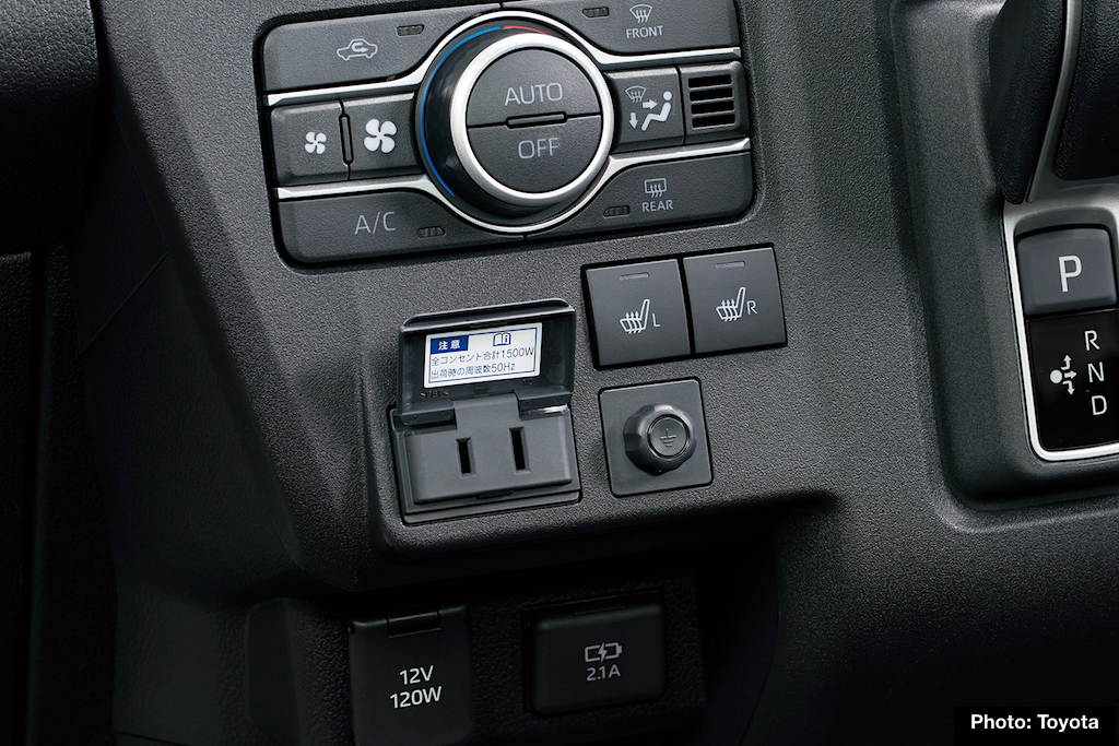 An external 1,500W (AC 100V) power supply is standard. Conveniently located on the lower instrument panel, it can charge things like electric power tools. It’s also said to be compatible with a Vehicle to Home (V2H) system. With a separately available V2H device, it can transfer power from the van’s battery to a home for household electricity.