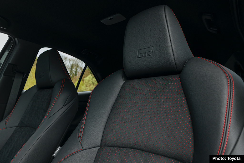 Inside, GR Sport is fitted with sport seats dressed with suede-type gray seating surfaces and red stitching. Adding to the ambience are GR logos on the front headrests and steering wheel, plus silver trim accents on the instrument and door panels.