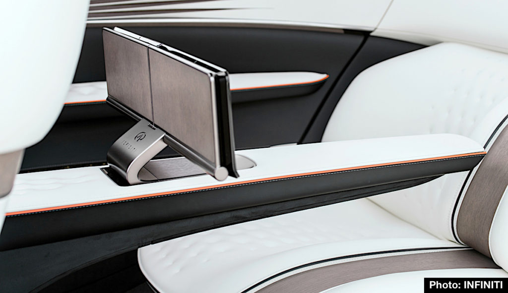 While Infiniti describes the cabin ambience as a “minimalist approach” it’s filled with futuristic features and luxury touches. For example, the driver and passengers can call up digital content on independent touchscreens without distracting others inside the car.