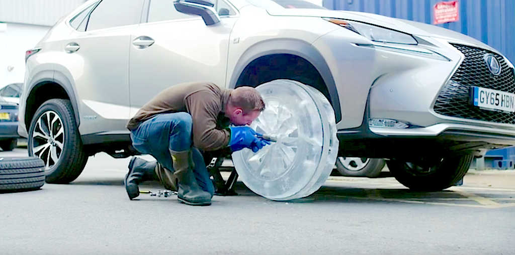 They’re not chrome-clad, powder-coated, wire-spoked or anodized. Instead, they’re made of frozen water. Four specially crafted wheels and “tires” made of ice were recently mounted to an NX and driven – slowly – on a road in London.