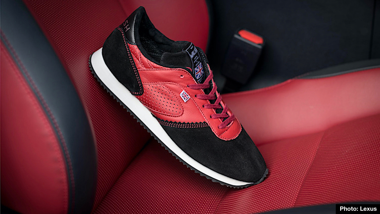 Like the hybrid hatchback’s cabin, the new footwear is trimmed with bright red perforated leather and black suede with contrasting stitching while a leather tab featuring the Lexus logo is affixed to one set of laces.