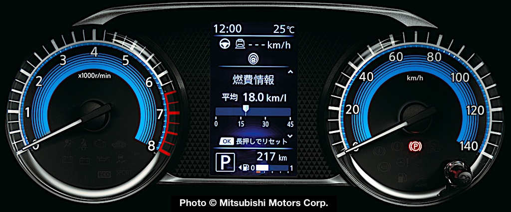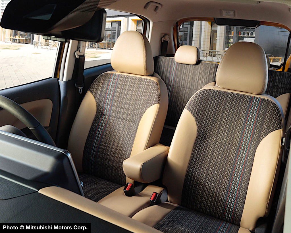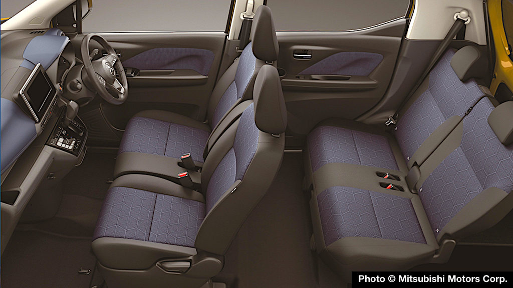 With its black-tone color scheme and sporty blue accents, eK X seats are trimmed with “crinkled fabric” and a honeycomb embossed finish. Mitsubishi says that rear seat knee room has been extended by 70mm to allow passengers to sit with legs crossed even with the front seats all the way back.