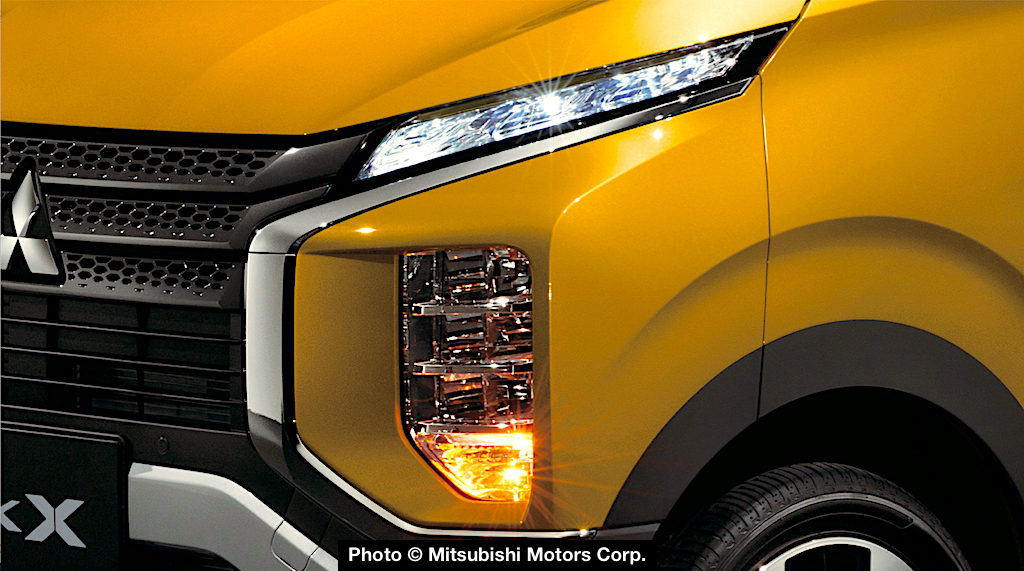 Mitsubishi says the eK X was developed with the “Cute Beast” concept that merges the automaker’s signature Dynamic Shield front styling with crossover cues to project a sense of “SUV power and toughness.” The wide grille with chrome bars is flanked by vertically stacked three-lens LED headlight clusters.