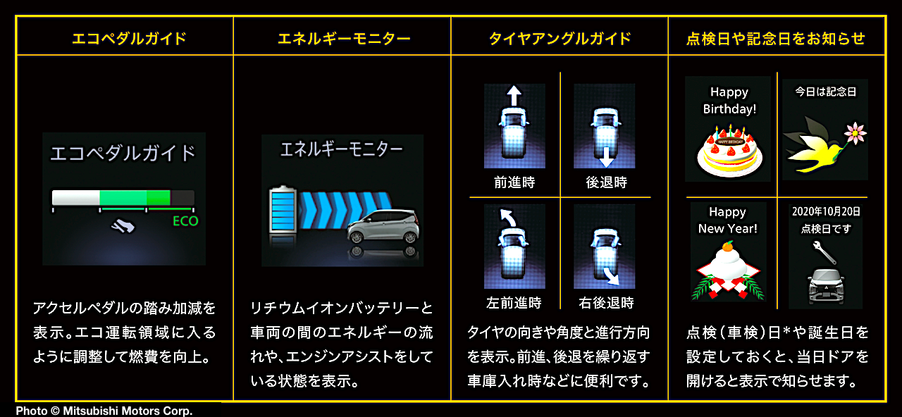 The Multi Information Display includes an Eco Pedal Guide (above left), that shows how hard the driver is pressing on the accelerator, and a Wheel Angle indicator that highlights the turning direction of the wheels during parking maneuvers.