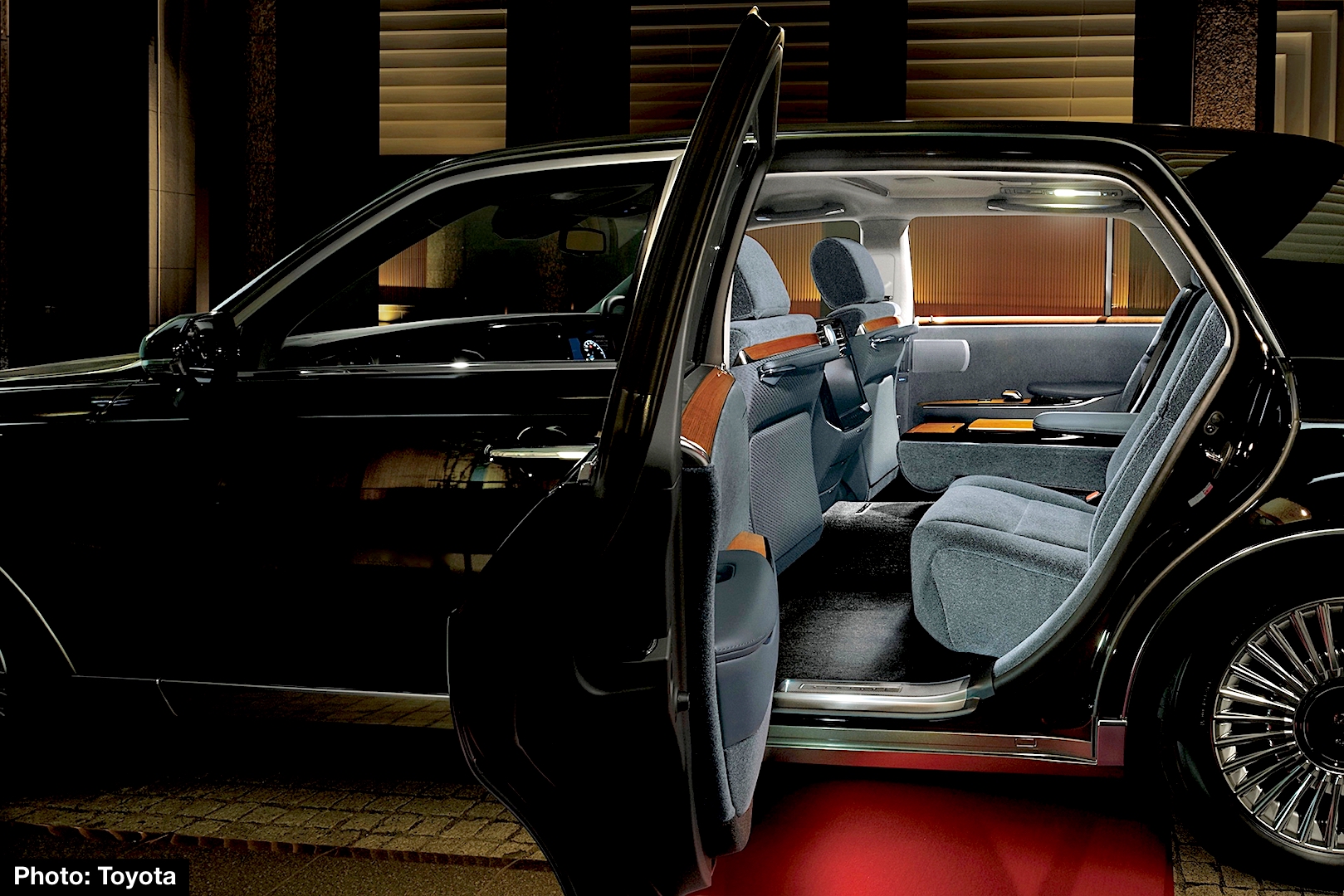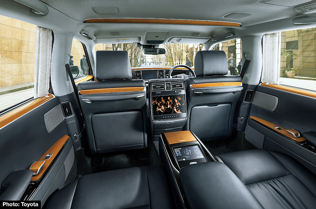 Toyota says the enhanced Century’s design reflects the Japanese aesthetic of passive symmetry while focusing on creating a “regal rear seating space.” At the side, the curve of the doors is said to be enhanced by a surface treatment used in the Heian period, while character lines contribute to an air of dignity and excellence.