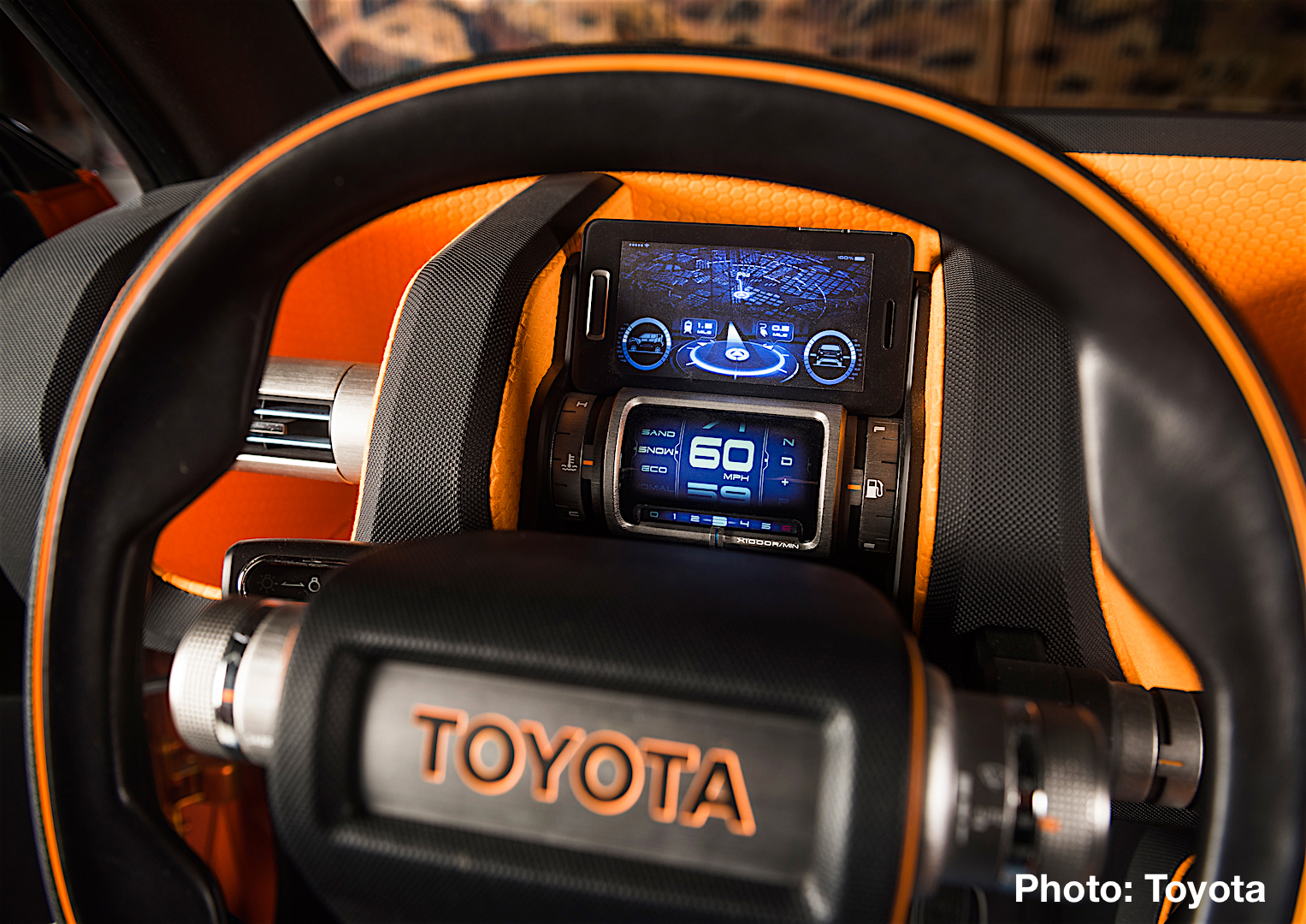 Although there’s no traditional navigation screen, designers did include a mobile phone mount directly above the driver’s digitized cylindrical instrument cluster. The concept being that a downloadable navigation application, as well as an application showing digitized off-road instrumentation, can be made available for drivers’ use. Gen Y-ers, Calty’s designers realized, rely heavily on their mobile devices for GPS directions.