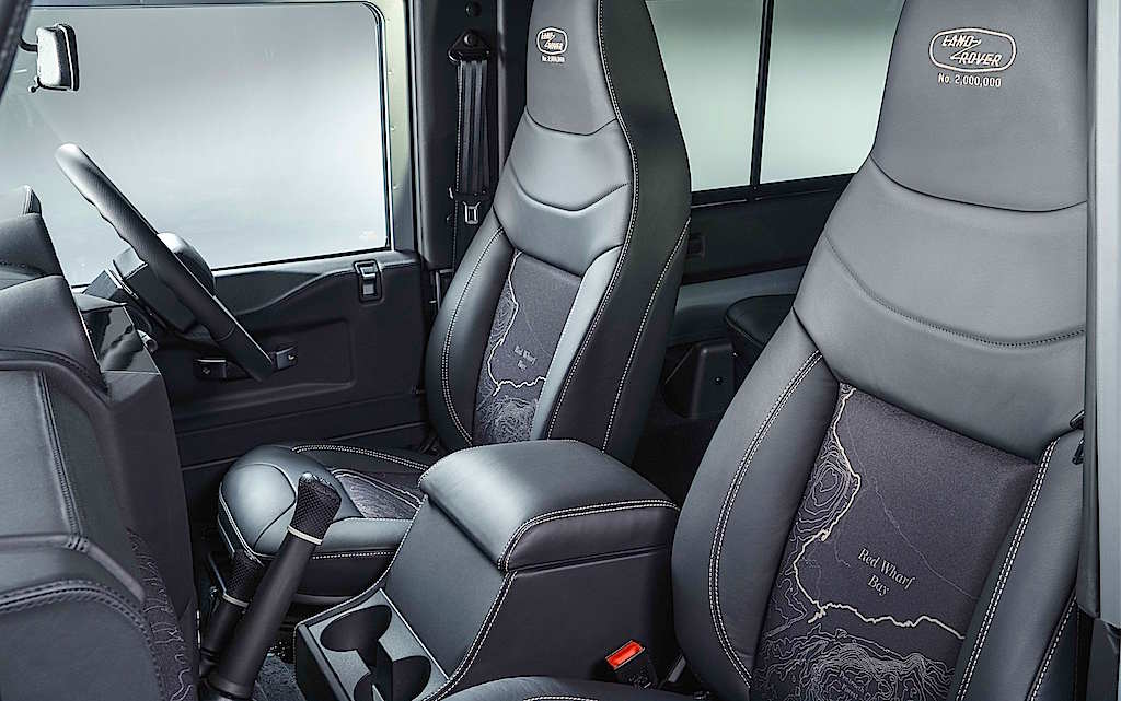 Inside, the leather-trimmed seats feature a Red Wharf Bay graphic and “2,000,000” logos are stitched onto the headrests. A bespoke aluminium plaque, signed by those who helped to assemble the vehicle is fitted to the driver’s seat plinth. On the outside, “S90 HUE” registration plates – a reference to the first pre-production Land Rover, registration “HUE 166” – complete this unique Defender.
