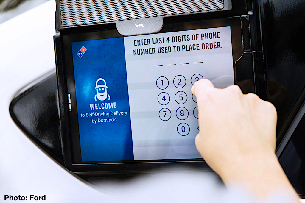 Ford and Domino’s completed preliminary testing of the delivery process using the vehicle in self-driving mode at Mcity, a simulated urban environment on the campus of the University of Michigan.