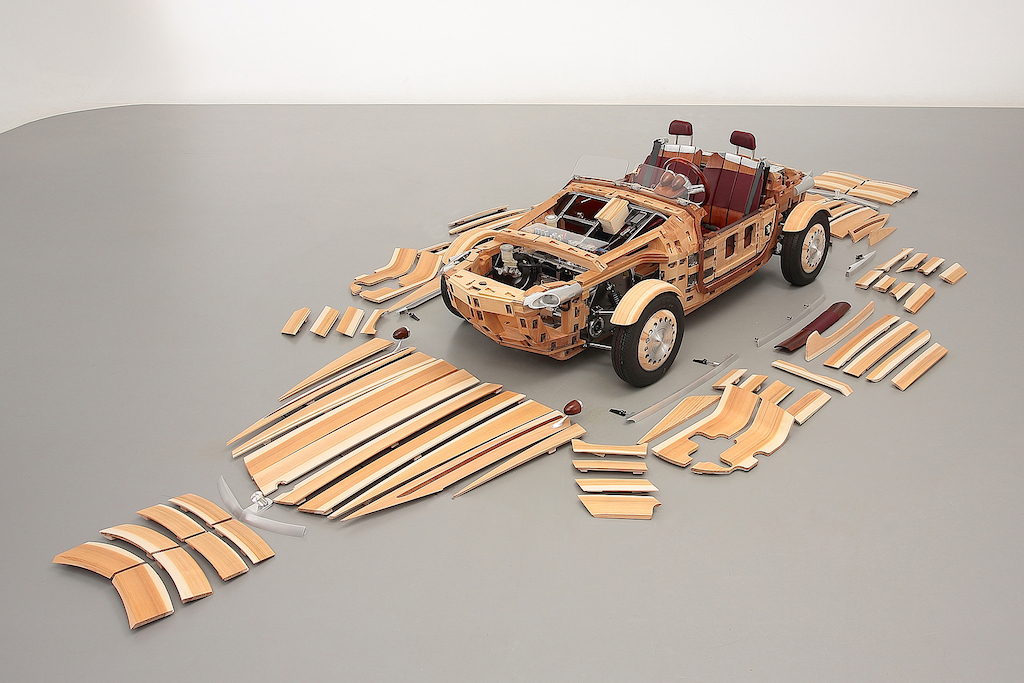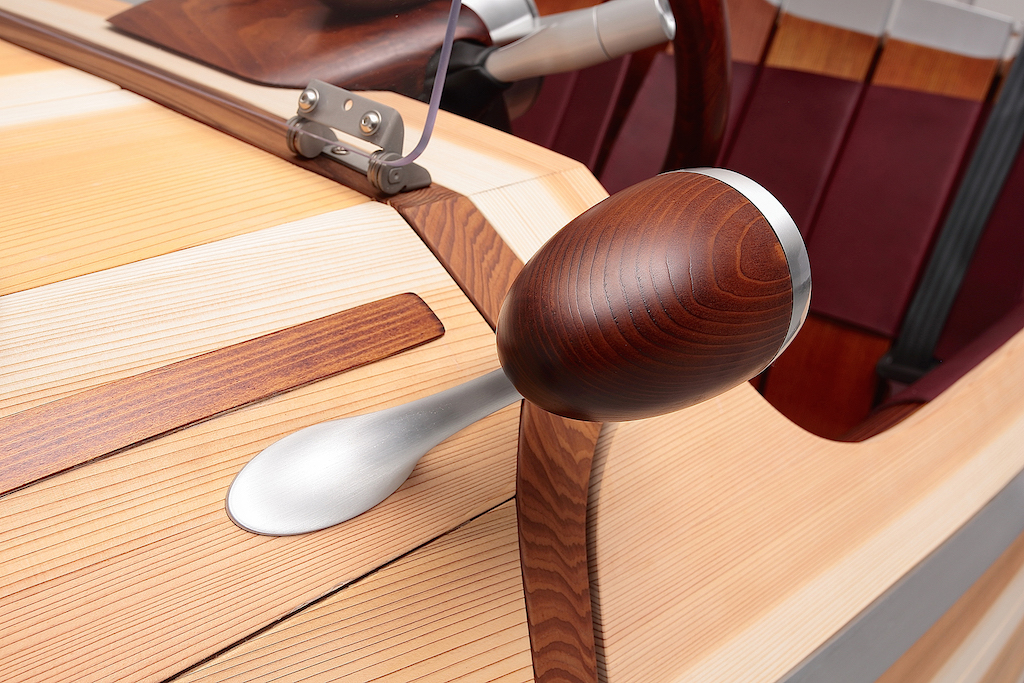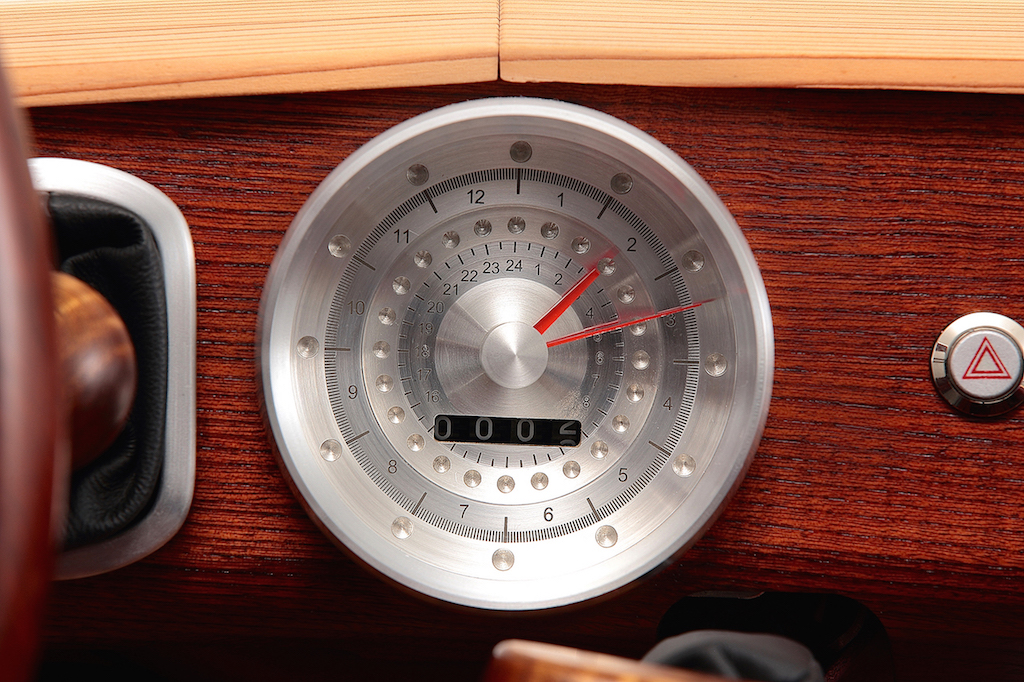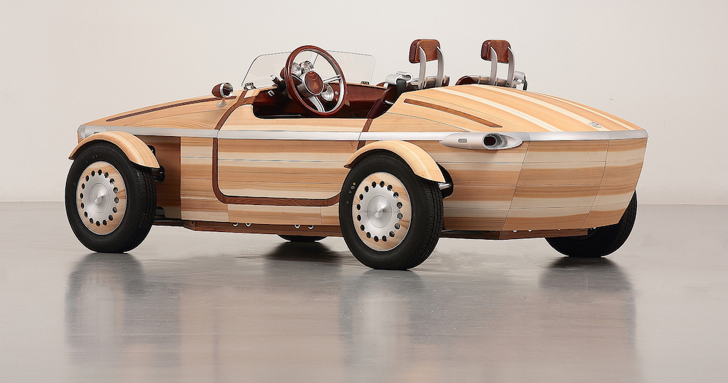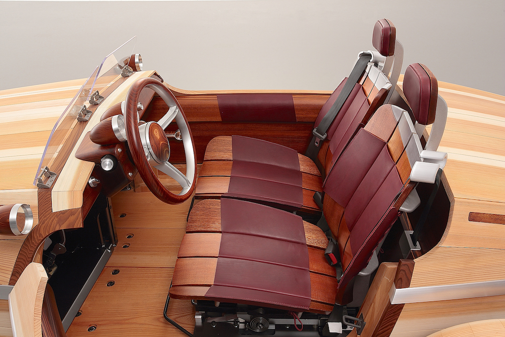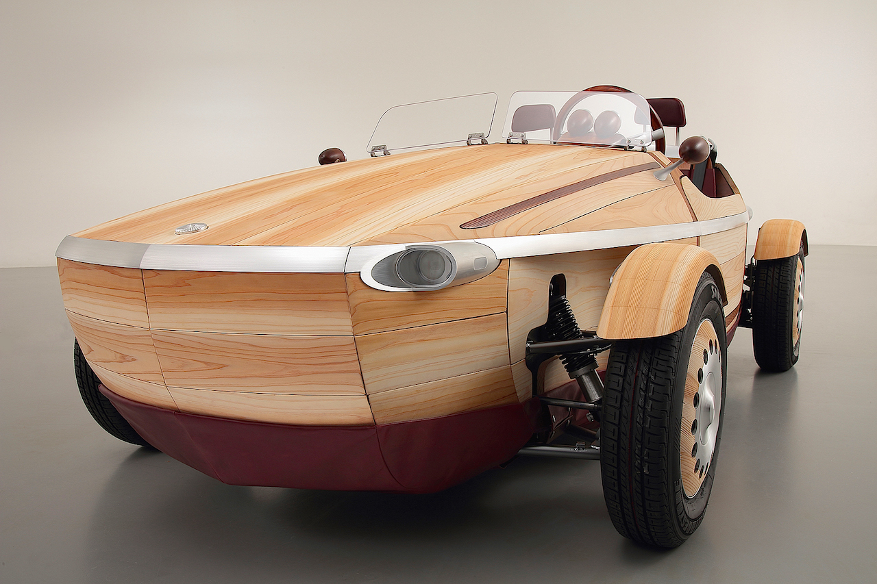 Setsuna is not a piece of furniture; it is a fully functioning car, although not road-legal. For this reason, different types of wood were chosen for specific parts of the vehicle: Japanese cedar, with its vivid grain and flexibility for the exterior panels; strong and rigid Japanese birch for the frame; hard-wearing Japanese zelkova, and smooth-textured castor aralia for the seats. The panels feature different grain patterns in the cedar, achieved with straight and cross-cutting of the raw timber, creating attractive contrasts.