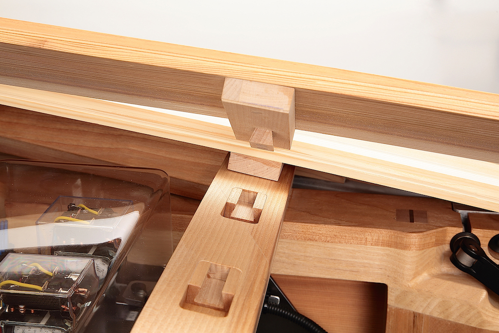 Sections of Setsuna have been crafted using traditional Japanese joinery techniques such as okuriari and kusabi. The former allows the panels to be fitted without using nails, so they can be easily removed. It makes for stronger joints and allows minor changes to be made to the mortise and dovetail joints if they become worn over time. The joints in the car’s frame feature split tenons fastened to through-tenons that pass through several component parts in the frame to give a secure hold.