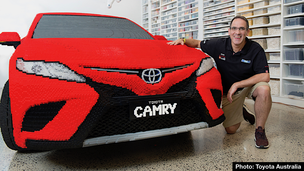 Ryan McNaught (above), aka “The Brickman,” recently built an amazing full-size Toyota Camry Hybrid SL replica using more than half a million LEGO bricks. The model took about 900 hours to assemble. It’s set to go on display this week at the “Brickman Awesome” exhibit in Melborne Museum Plaza.
