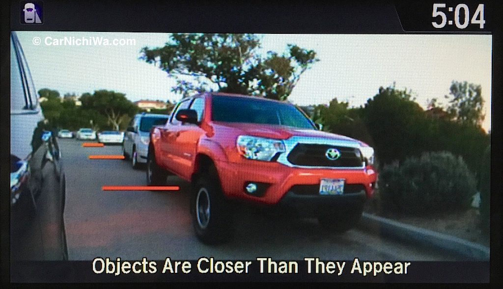 Our tester was loaded with safety features. Honda LaneWatch™ is activated when signaling a right-hand turn. As we show above, items that might be in the “blind spot,” like a bike or Toyota Tacoma, are conveniently displayed on the center screen.
