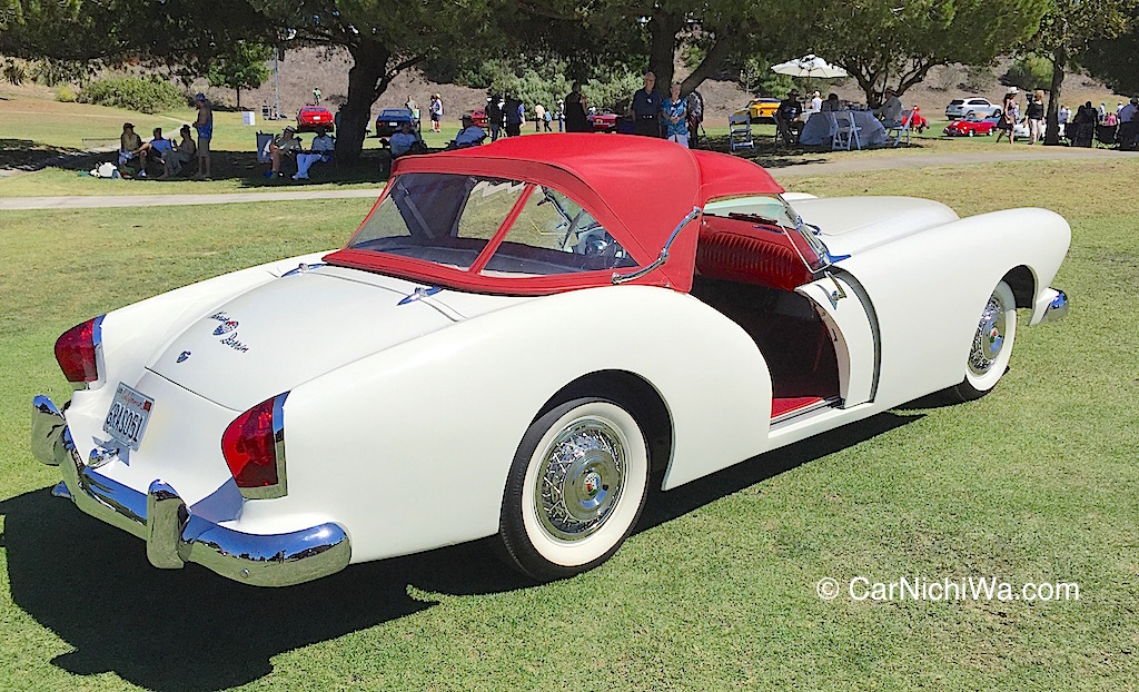 This excellent example of a 1954 Kaiser Darrin fiberglass bodied roadster made the journey to Palos Verdes from Palm Desert.