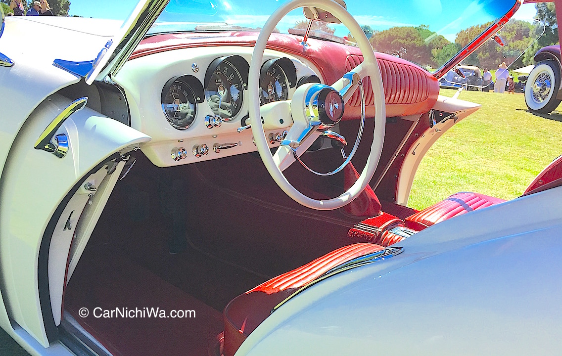 Turning our attention to Cadillac, we marveled at the grand scale and flamboyant details of the marque. This 1953 Eldorado Convertible from Torrance looked just right dressed in its red-red combo.