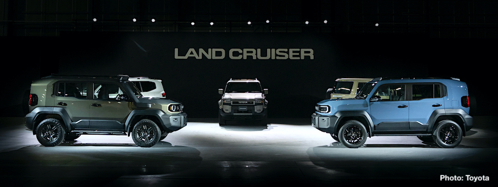 Toyota brought the current Land Cruiser lineup to welcome the new model to the family, including the flagship 300 Series, midrange 250, and rugged Land Cruiser 70 (left-right in the above second row). Prototypes of the new FJ include a customized version that was described as “overseas” specification, along with the future regular production FJ.