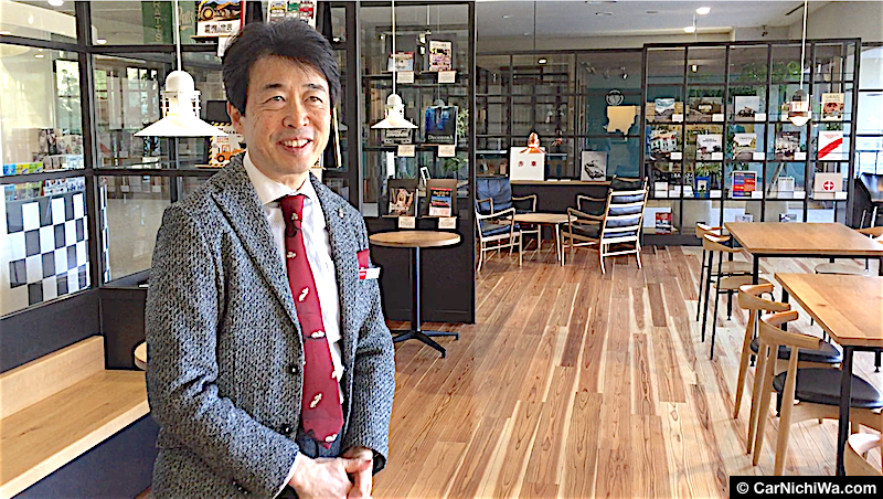 Mr. Nunogaki was happy to show us the new Cars & Books Café. We learned that the floor was renovated using cedar timber obtained through forest thinning.